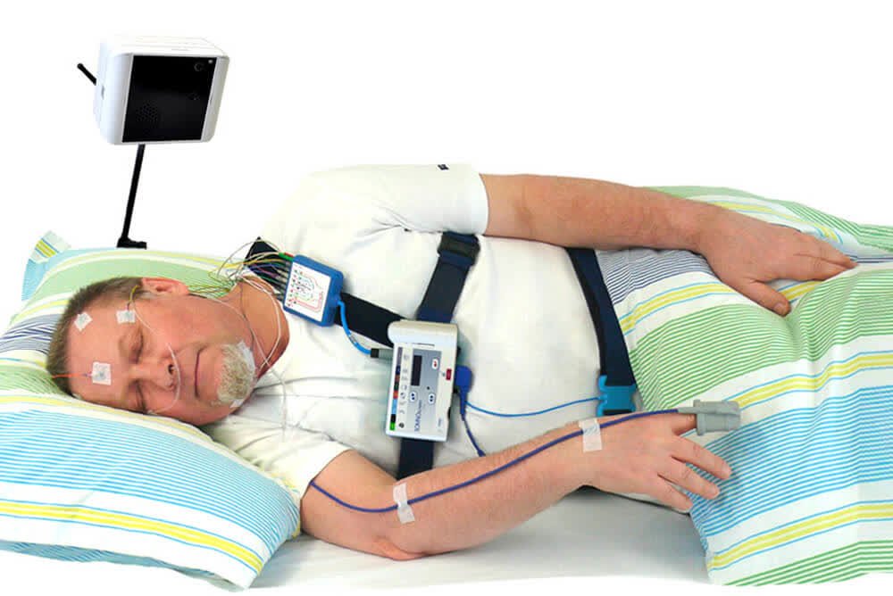 Tests to detect sleep apnea include: Nocturnal polysomnography. During this test, you're hooked up to equipment that monitors your heart, lung and brain activity, breathing patterns, arm and leg movements, and blood oxygen levels while you sleep.